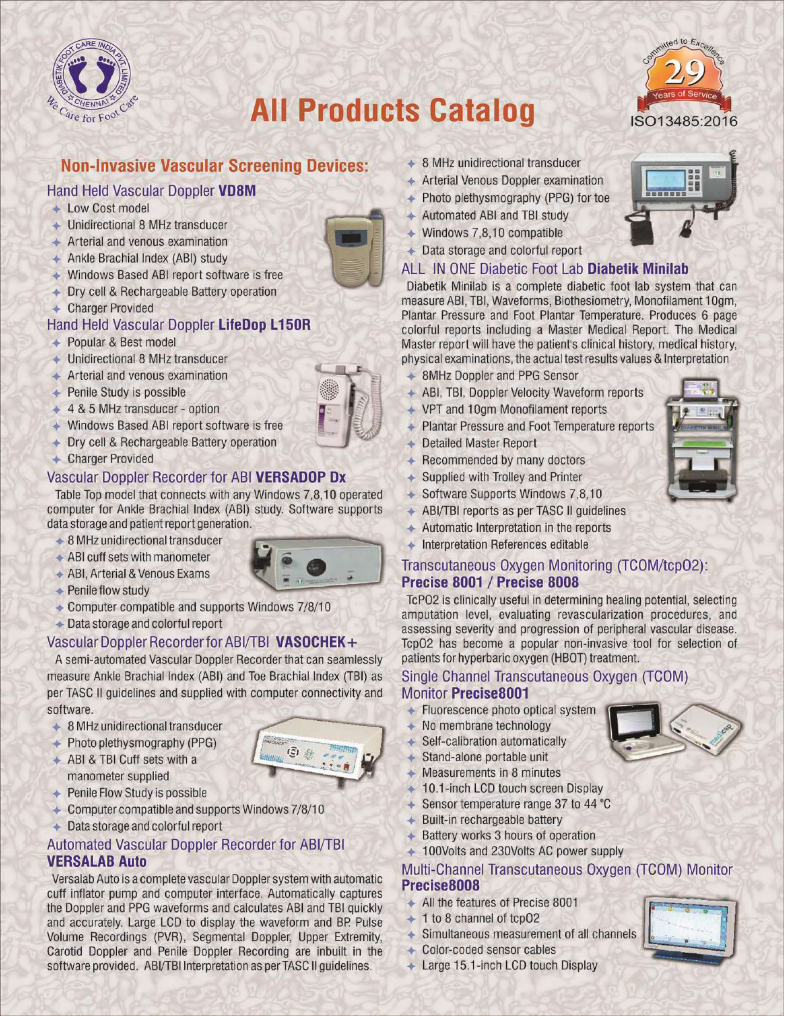 Diabetik Foot Care India Pvt Ltd is a pioneer in the manufacturing and distribution of medical devices for the management of diabetic foot and its complications. Our products are working in as many as 34 countries. More than 25 field sales cum service engineers are working across India to take care of sales and after sale services. Most of the leading institutions treating diabetes are our clients. Our Product Range: Handheld Vascular Doppler, Vascular Doppler Recorder, Automatic Vascular Doppler Recorder, Digital Biothesiometer, Podiascan, Foot Scanner, Pedography, Plantar Scan Systems, tcpO2, Monofilament 10gm, Neuropathy Therapy Stimulator, IR Light Theraphy, Podiatry chair and instruments are our major products.